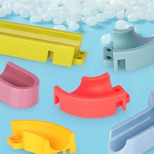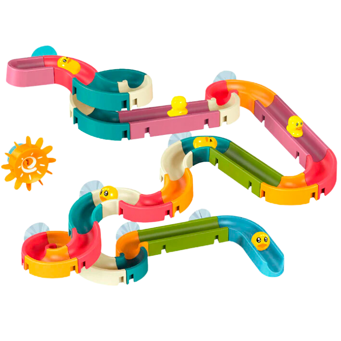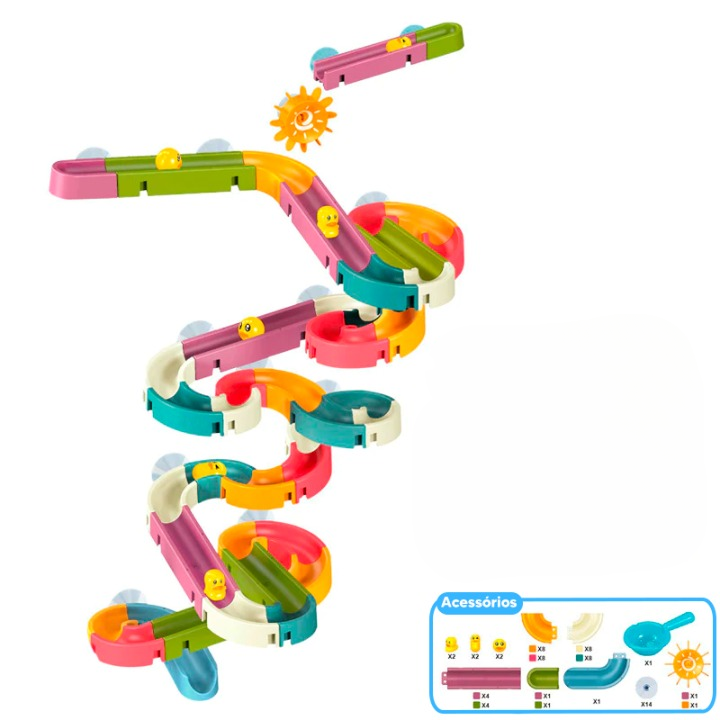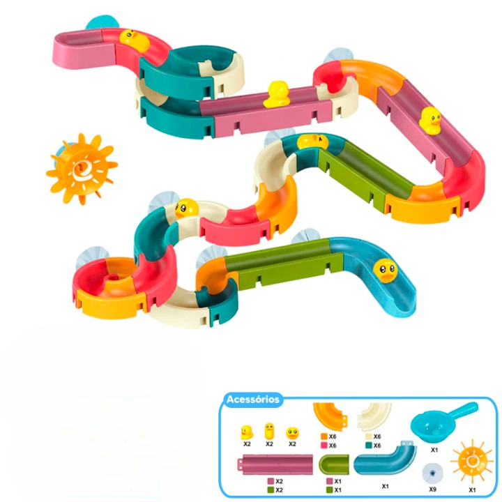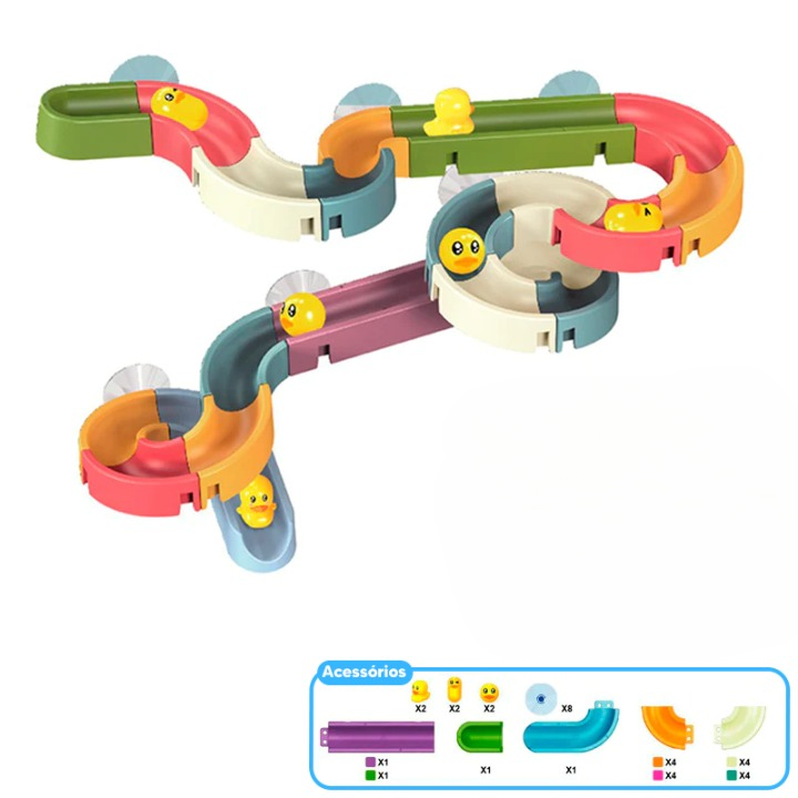 48 PEÇAS= 31 Peças do Tobogã, 6 Patos, 9 Ventosas, 1 Moinho de Água e 1 Pegador.