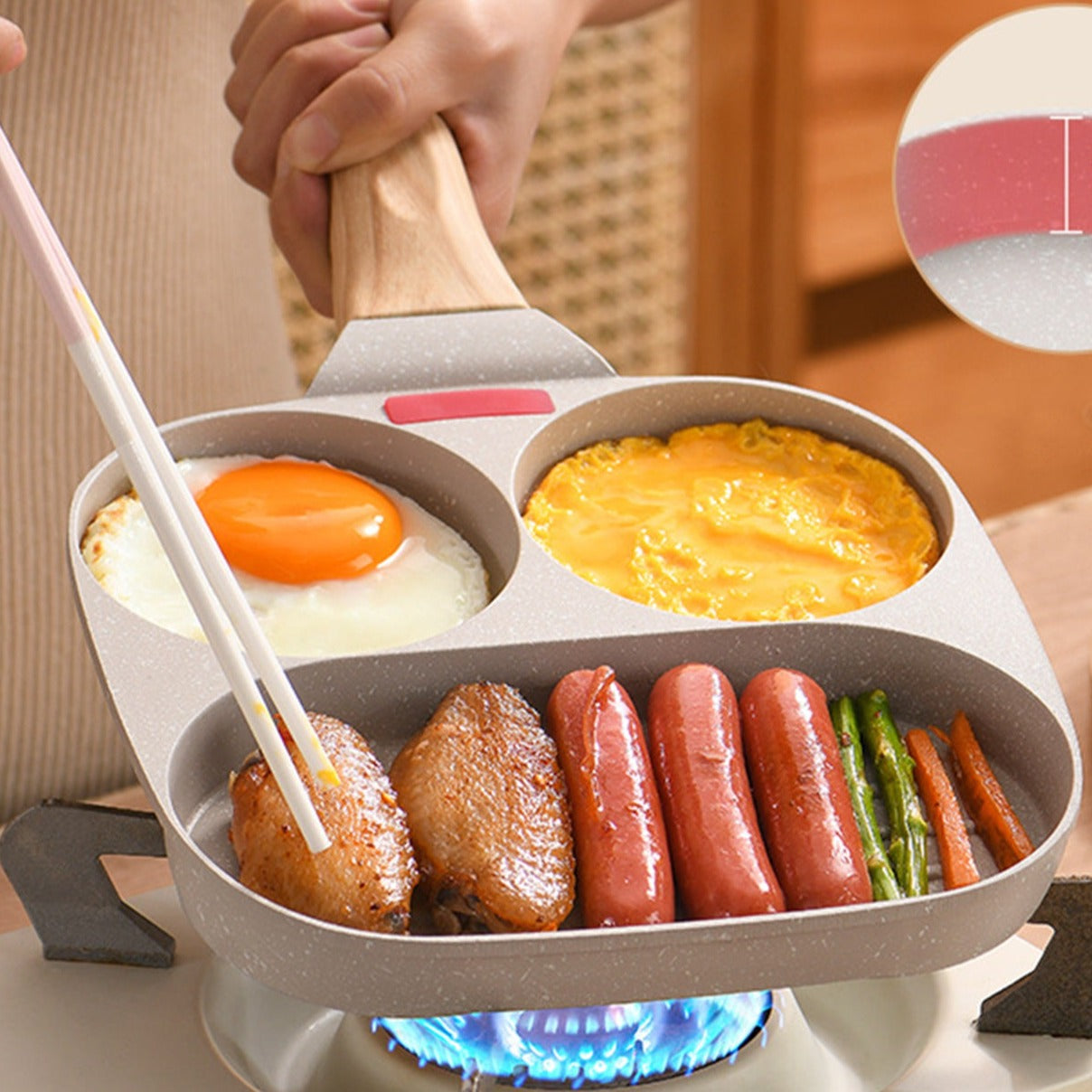 Escolhendo a frigideira 4 em 1 você consegue fritar quatro ovos ou hambúrgueres com diferentes sabores ao mesmo tempo ou fritar quatro alimentos diferentes. Ou se for a frigideira 3 em 1 você prepara 3 alimentos ao mesmo tempo com mais espaço. Esta é eficiente e atende às necessidades diárias do café da manhã de toda a família.