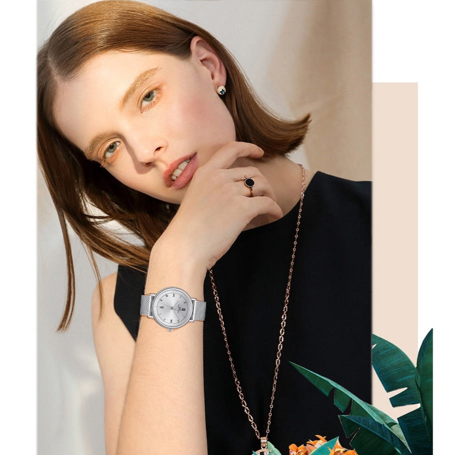 O Relógio possui qualidade, beleza excepcional e design exclusivo, com materiais de alta qualidade, feito de Prata e acabamento impecável com muito brilho, totalmente inspirado em mulheres modernas.